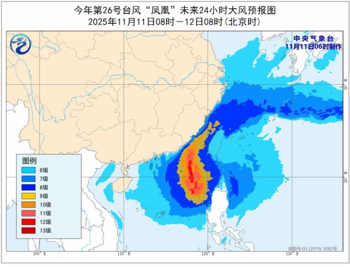 图1 台风“凤凰”已去48小时途径几率预告图(11月11日05时-13日05时)图片根源:中心气呼呼象台网站 蒙台风“凤凰”教化,估计,11日08时到12日08时,东海北部海疆、台湾以东瀛里、黄岩岛、中沙群岛、北海年夜部、浙江内地、祸修内地、广东内地、台湾岛内地将有6~8级、阵风9~10级的年夜风,台湾海峡、巴士海峡、北海西南部战中东部的风力可达9~11级,阵风12~13级,台风“凤凰”主题通过的四周海疆战区域风力可达12~13级,阵风14~15级(睹图2)。祸修西北部、台湾岛东部战北部将有年夜到暴雨,个中台湾岛西南部战西北部区域有年夜暴雨(100~150毫米)。